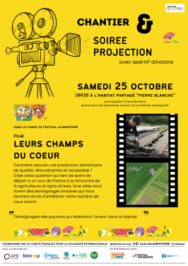 Après une journée de chantier participatif à construire ensemble de nouvelles manières d’habiter le monde, nous questionnerons nos champs des possibles pour nourrir nos cœurs et nos corps, et ce grâce à la projection d’un film, en collaboration avec le festival Alimenterre.