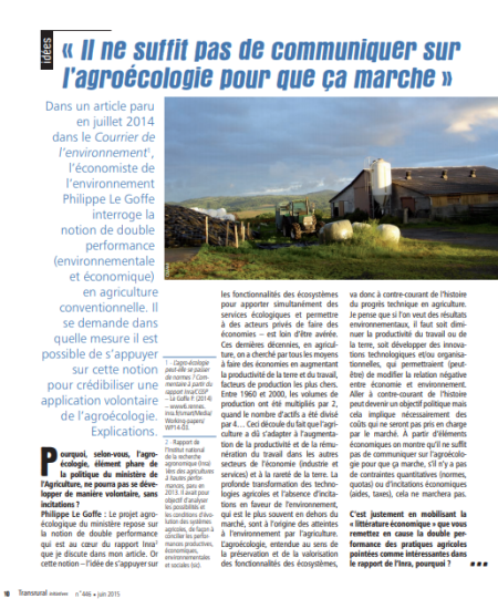 Dans un article paru dans le Courrier de l'environnement et Transrural Initiatives, l'économiste de l'environnement Philippe Le Goffe interroge la notion de double performance (environnementale et économique) en agriculture conventionnelle. Il se demande dans quelle mesure il est possible de s'appuyer sur cette notion pour crédibiliser une application volontaire de l'agroécologie.