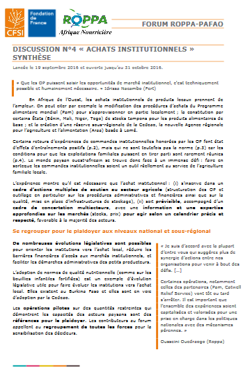 Une trentaine d'organisations, à la fois des OP membres du Roppa et des organisations du réseau « Pafao » (OP et ONG) ont échangé dans le cadre d’une discussion en ligne sur les achats institutionnels, ce document de 6 pages présente l'essentiel à en retenir.
