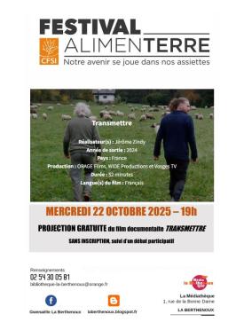 La médiathèque, partenaire du festival Alimenterre 2025 vous propose une projection gratuite, sans inscription, le mercredi 22 octobre à 19h, suivi d'un débat participatif. Cette année, le film documentaire sélectionné est "Transmettre".