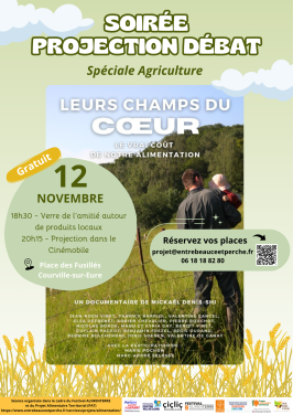 La Communauté de Communes Entre Beauce et Perche vous propose, dans le cadre de son Projet Alimentaire Territorial (PAT) et du Festival ALIMENTERRE, une soirée projection-débat autour du documentaire "Leurs Champs du Cœur" le mercredi 12 novembre 2025 à partir de 18h30 à Courville-sur-Eure.